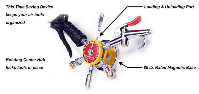 Magnetic base rated at 85 lbs. attaches to tool boxes, air compressor frames, auto lifts, tool carts, service trucks, steel benches, wood frame buildings by using steel adaptor plate, or any other metal surfaces